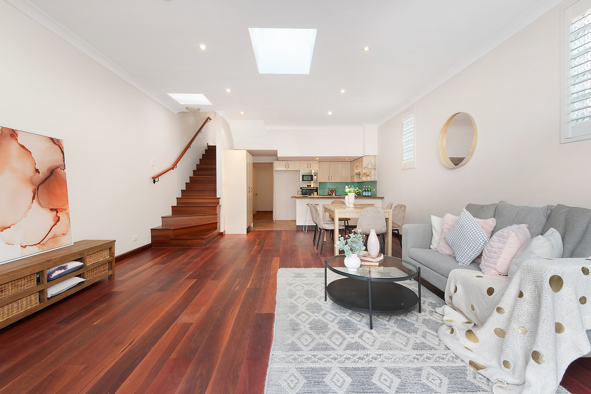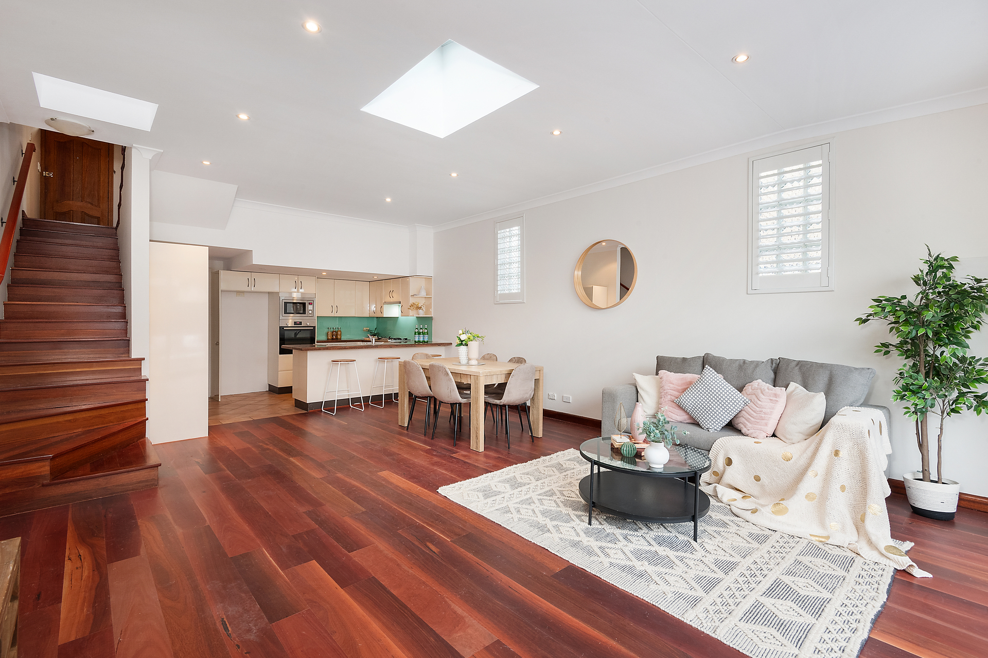 Stylish cantilevered stairs connect the upper storeys that feature three large bedrooms, while another solid timber staircase entices down to a skylit open social centre on the ground floor.